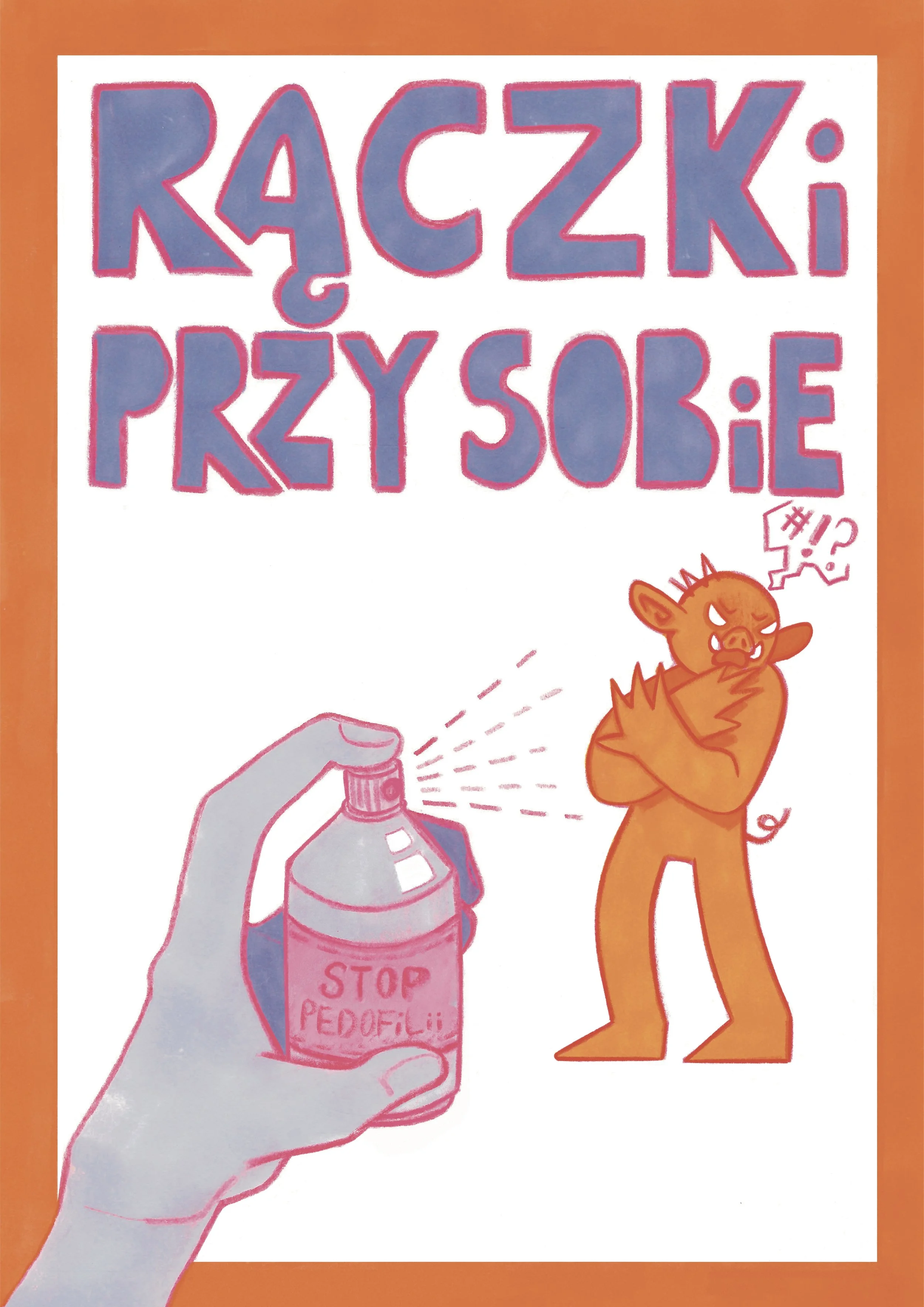 One of the minimalistic artistic poster with the slogan "Rączki Przy Sobie" and a depiction of a person trying to commit act of pedophilia as a wild boar.